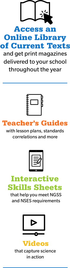 Introduce your students to the wonders of science and engineering with Science Spin. Every issue comes with powerful print + digital resources that save prep time and address key science skills.